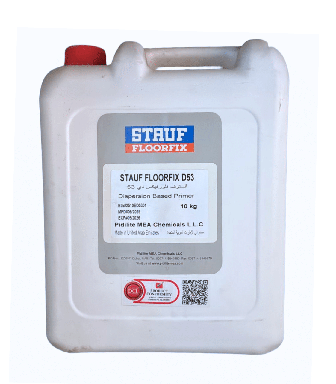Stauff Floorfix D53 is a ready-to-use, low-emission, dispersion-based primer designed to bond adhesives and levelling compounds to various subfloor types, including porous and non-absorbent ones. The 10 KG packaging indicates the product is sold in a 10-kilogram container. Key features include a drying time of approximately 60 minutes at a coverage of about 125 g/m² and it forms a closed film on non-absorbent surfaces and soaks into porous ones.