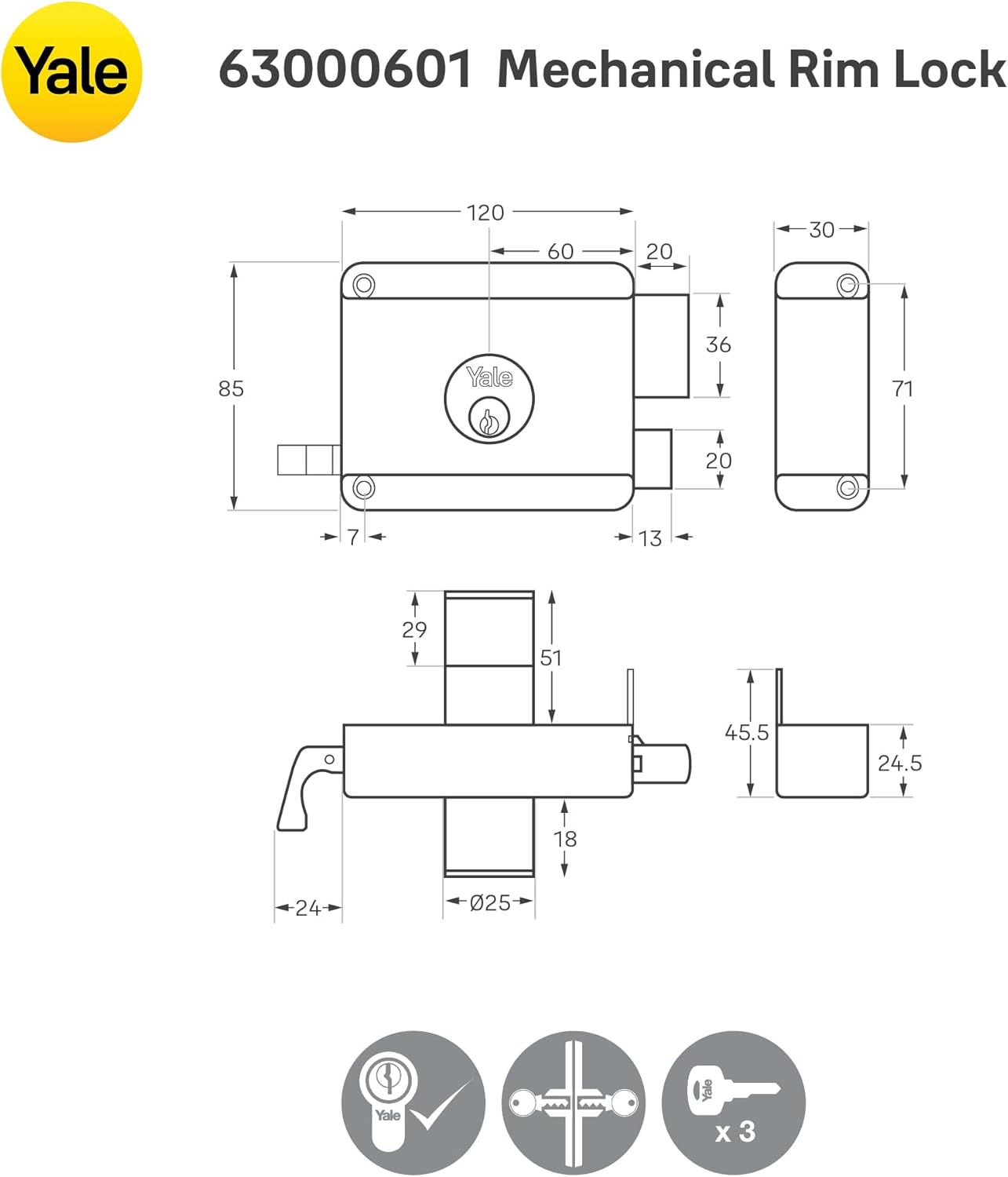 Yale 63000601 Mechanical Rim Lock with Dimple Key, Multicolor, Two Side Keys, Right